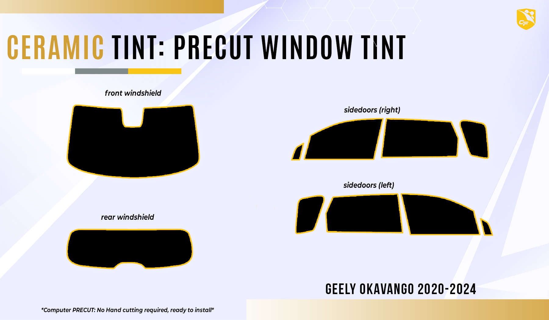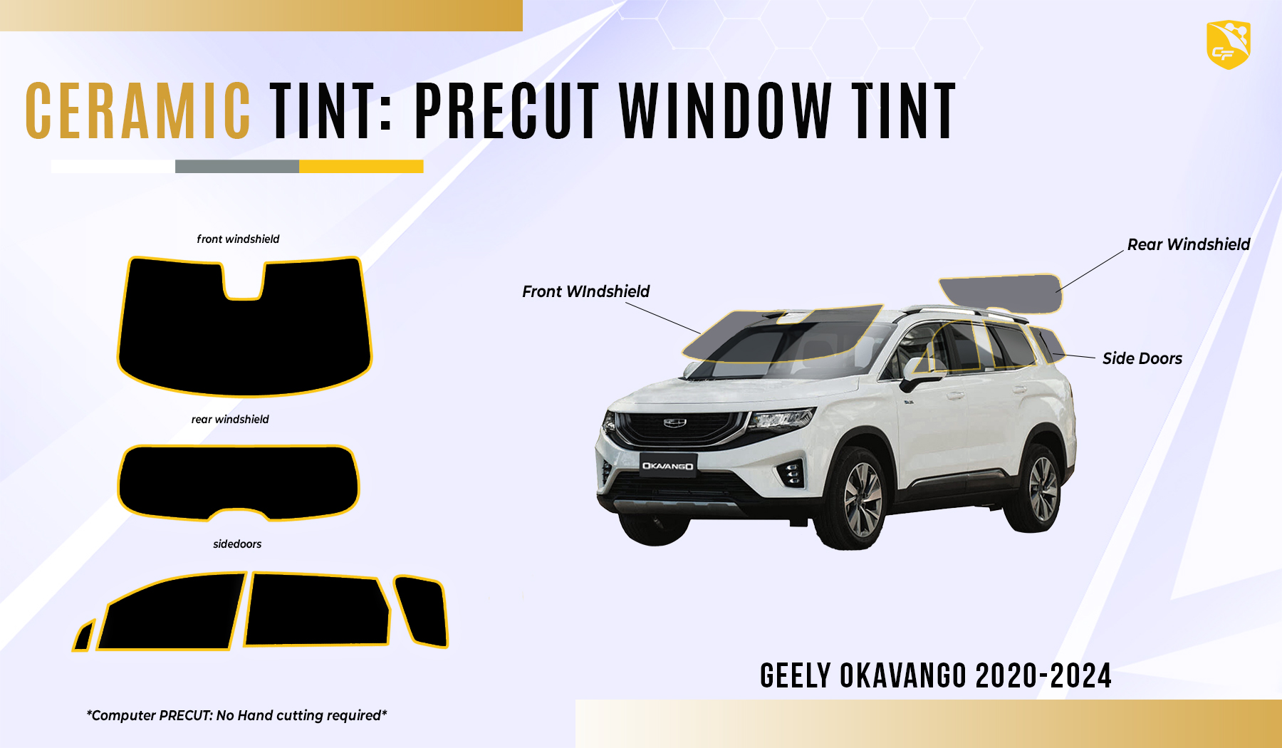 Upgrade your Geely Okavango with CoolFilms Pre-cut Nano-Ceramic Tint, offering precision fit, ultimate heat rejection, and advanced UV protection for enhanced style and comfort.