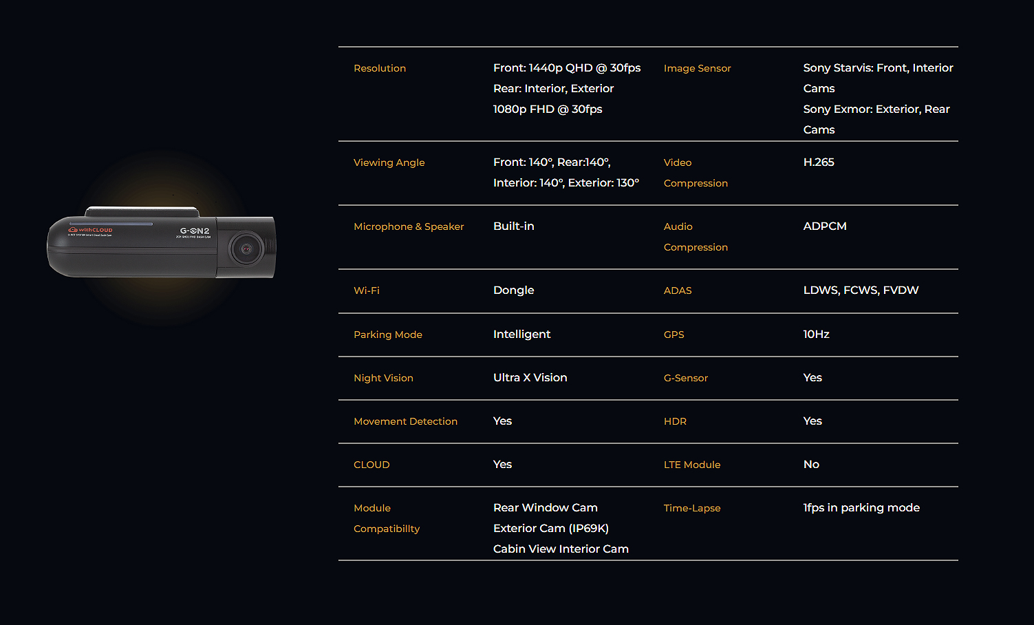 | Resolution | 2K or 1440P Resoultion Front and 1080P Rear with Sony STARVIS Sensor |