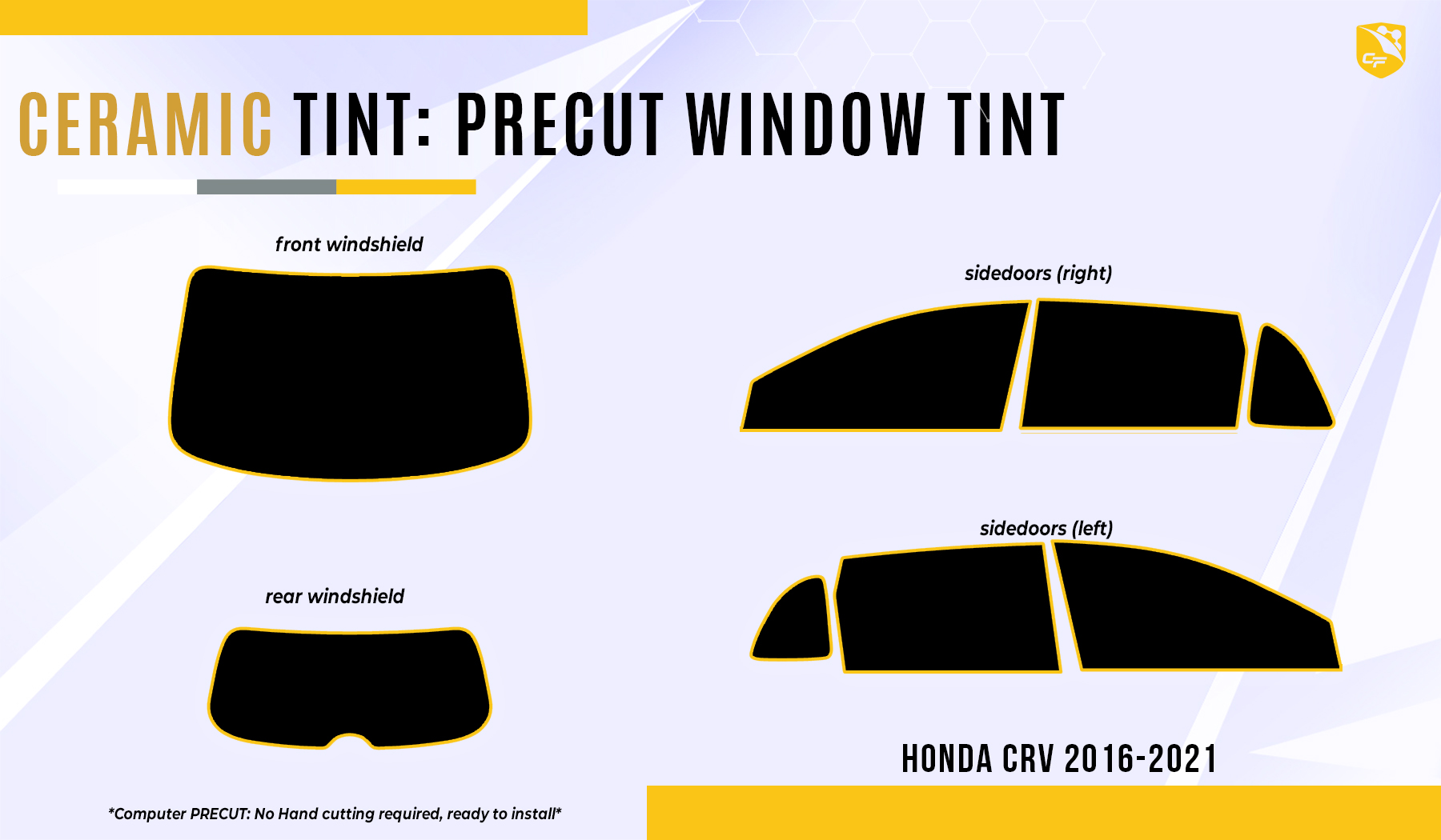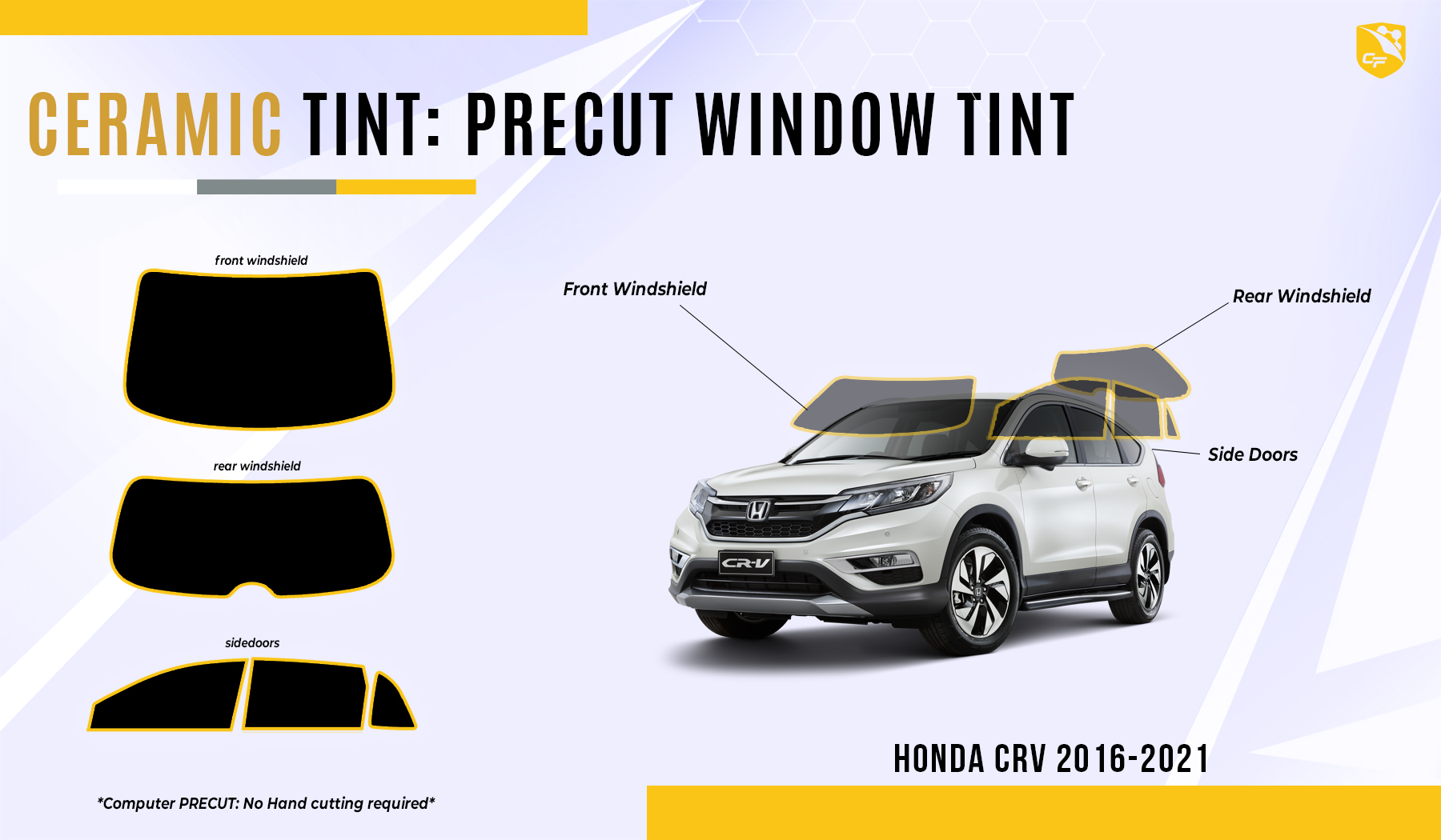 Upgrade your Honda CRV with CoolFilms Pre-cut Nano-Ceramic Tint, offering precision fit, ultimate heat rejection, and advanced UV protection for enhanced style and comfort.