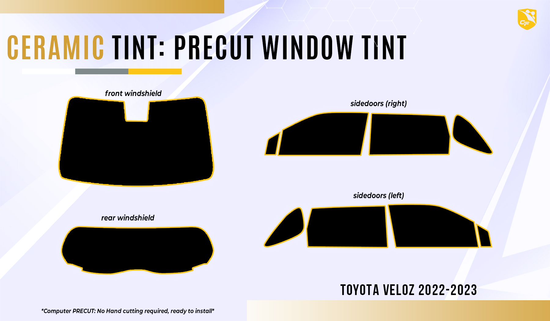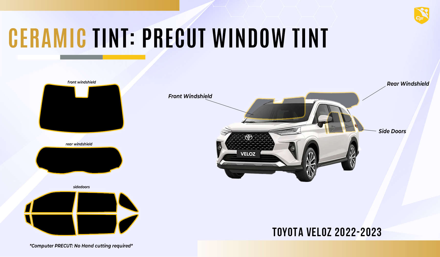 Upgrade your Toyota Veloz with CoolFilms Pre-cut Nano-Ceramic Tint, offering precision fit, ultimate heat rejection, and advanced UV protection for enhanced style and comfort.